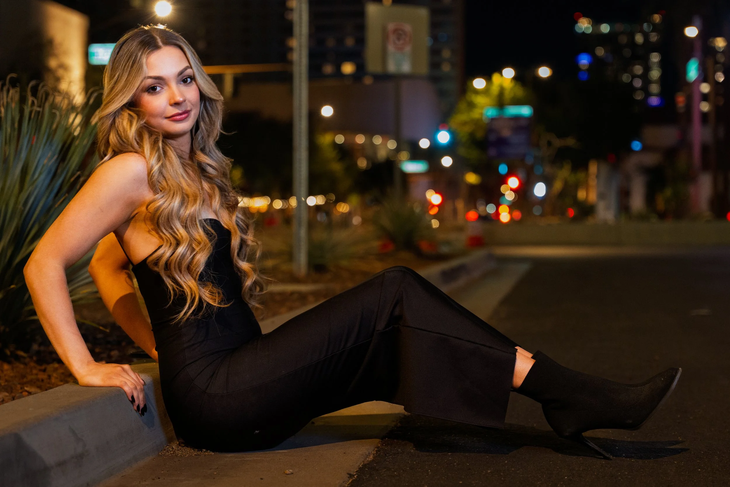 Mac and I shot a nightlife-style session downtown. I asked her to wear elegant, sexy—think a lawyer stepping out after a black-tie event—and she absolutely nailed the look. We kept things fast and flexible with a one-light setup for mobility and quick location changes, which let us capture a variety of moods and backdrops throughout the evening.